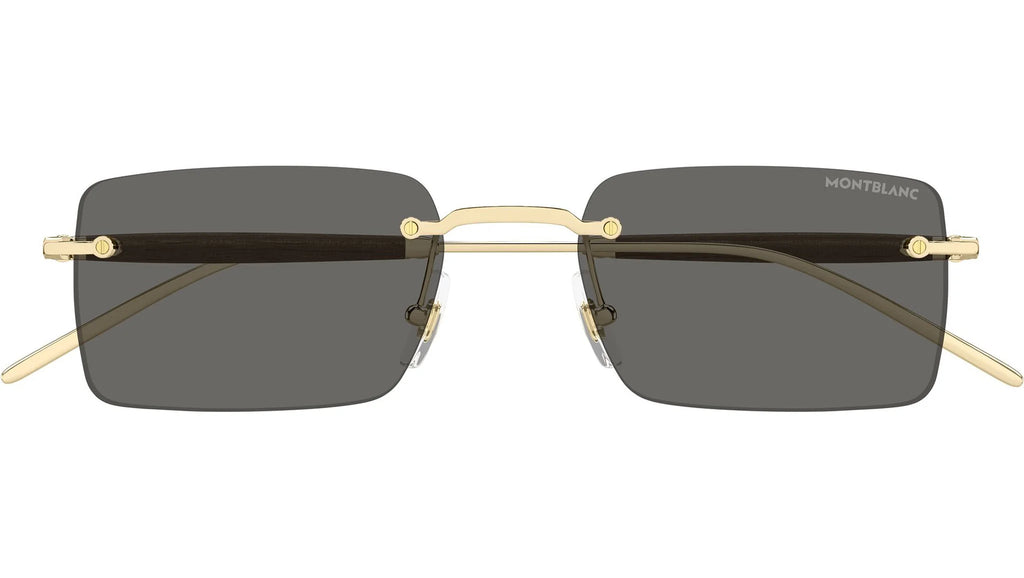 Montblanc MB0453S 001 sunglasses for men, featuring shiny light gold rectangular metal frame and solid grey bio nylon lenses. Brand line: Meisterstück. Style code: MB0453S. Color code: 001. Made in Italy. Authorized Montblanc online reseller.