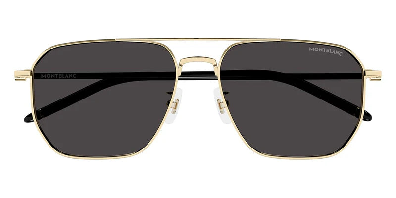 These sunglasses in a squared style have a gold coloured metal frame and grey lenses. They feature a double metal bridge on the front. The tubular temple inspired by the Meisterstück writing instruments is enriched with a 3 rings detail. The Montblanc logo is lasered on the left lens and a black enamel detail is encapsulated on the end tips.