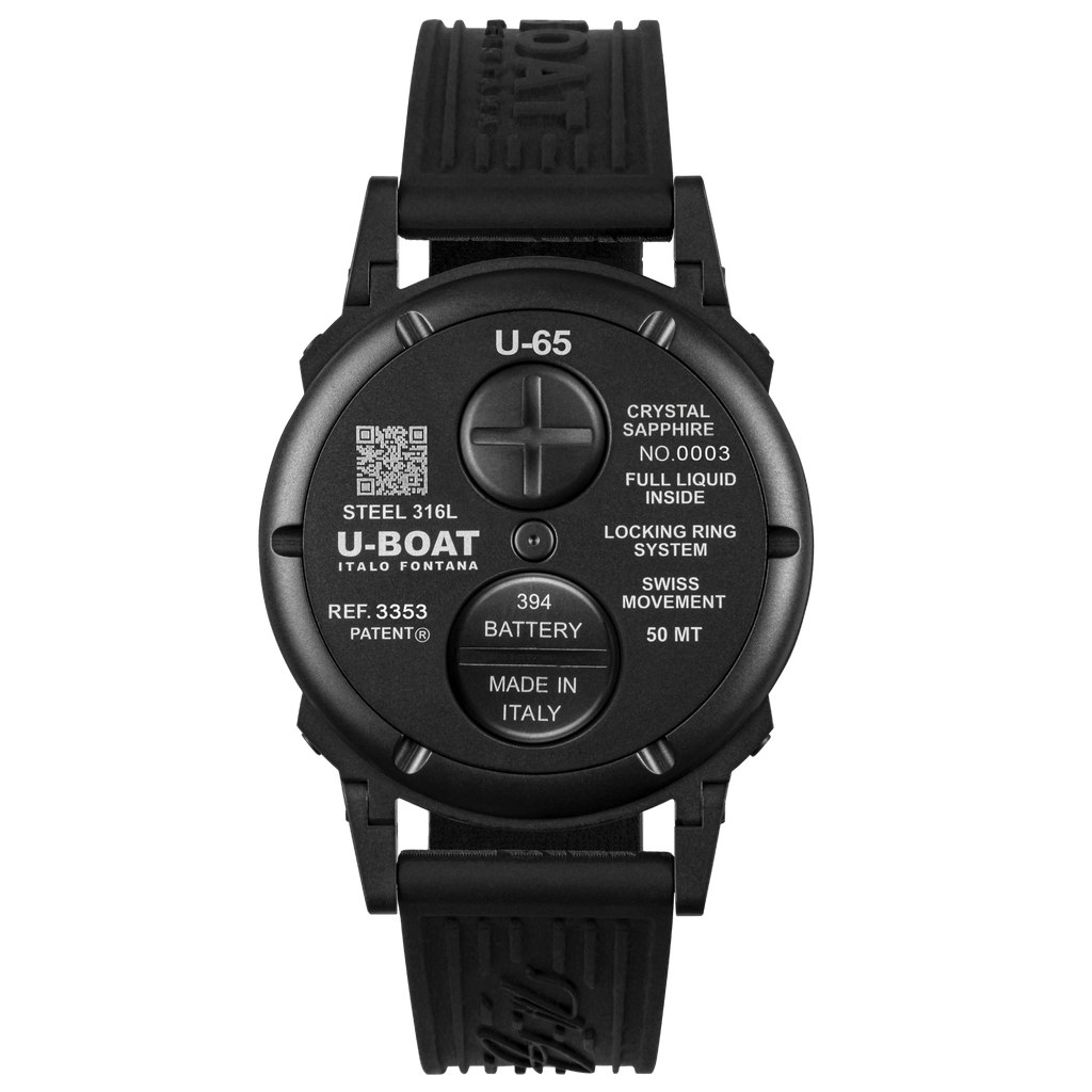 Made from AISI 316L steel with a black PVD treatment, the case is fully filled with a special oil that enhances the dial, creating the illusion of the absence of glass, with a more intense color effect and better readability. A visible air bubble on the dial compensates for temperature changes. Movable lugs. Diameter: 44 mm.