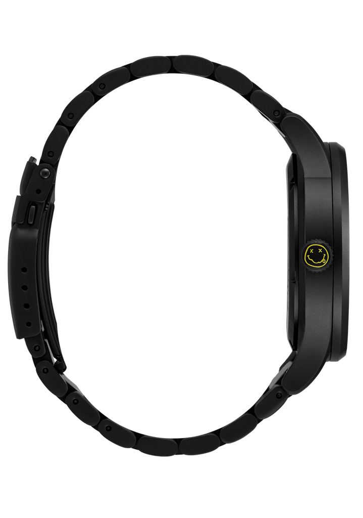 Your eyes are not playing tricks on you. Meet the Nirvana Sentry Wobble. Our iconic mid-size analog watch has been bent, molded, and contorted to match Cobain's hand drawn iconic smile graphic found on the dial and crown. The face pops with depth and detail, and the solid stainless steel case, hardened mineral crystal, and waterproof rating of 50m allow for everyday use.